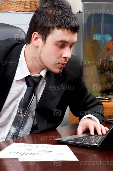 Молодой бизнесмен, работающий на ноутбуке в офисе