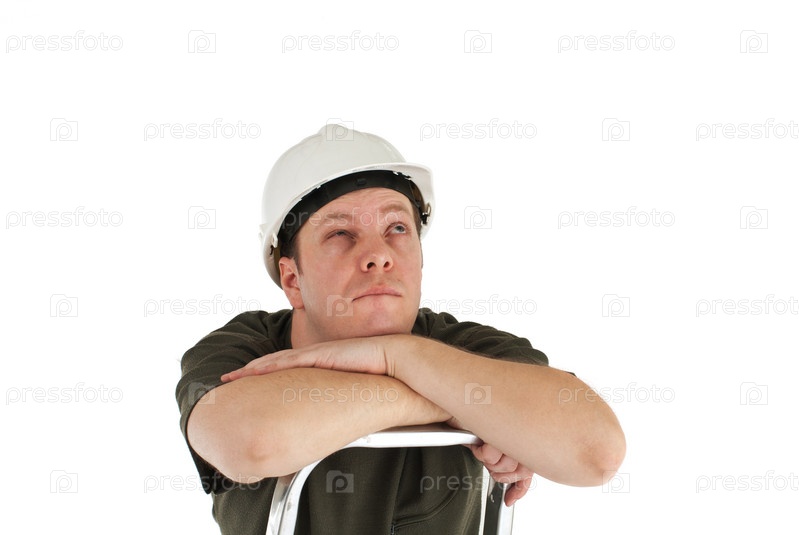 Портрет строителя в каске на лестнице на белом фоне