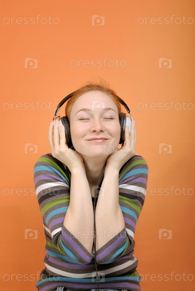 Красная молодая женщина в наушниках