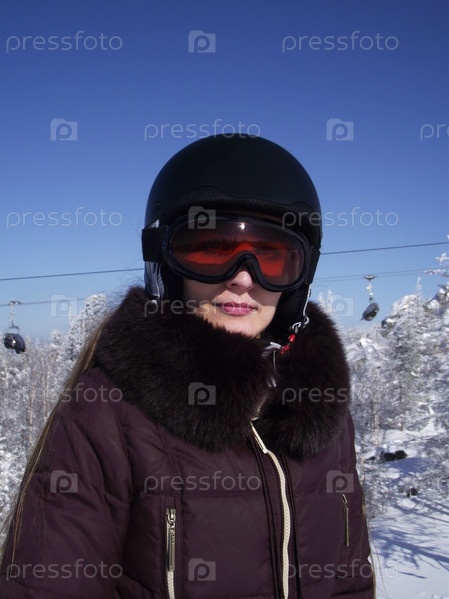 Красивая молодая женщина в защитных шлеме для сноуборда и очках на фоне голубого неба на горнолыжной трассе