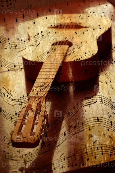 Гитара на фоне нотных тетрадей
