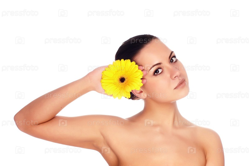 Портрет свежей и красивой женщины с цветом, изолированным на белом