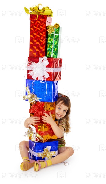 Счастливый ребенок обнимает огромную кучу подарков на белом фоне