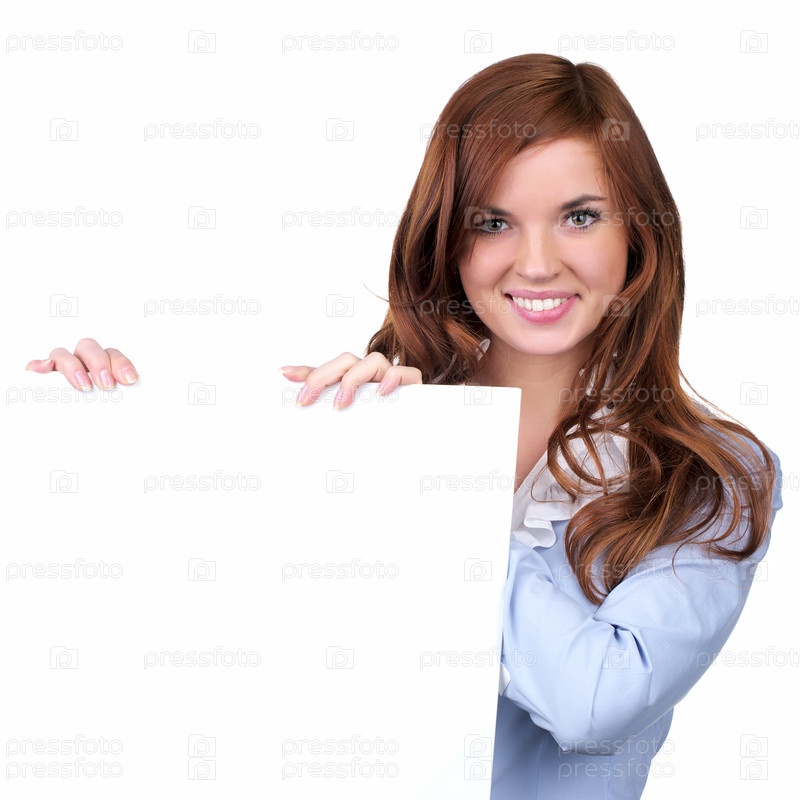 Молодая женщина, держащая пустой рекламный щит, на белом фоне