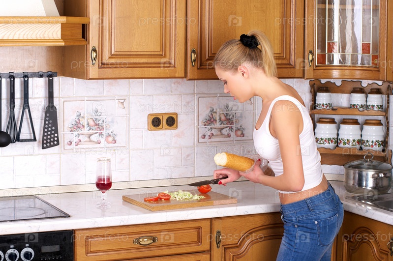 Девушка делает бутерброд на кухне