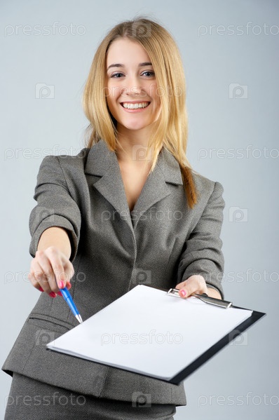 Молодая деловая леди просит вас подписать бумаги