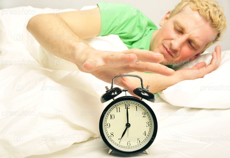 Сонный мужчина пытается выключить будильник