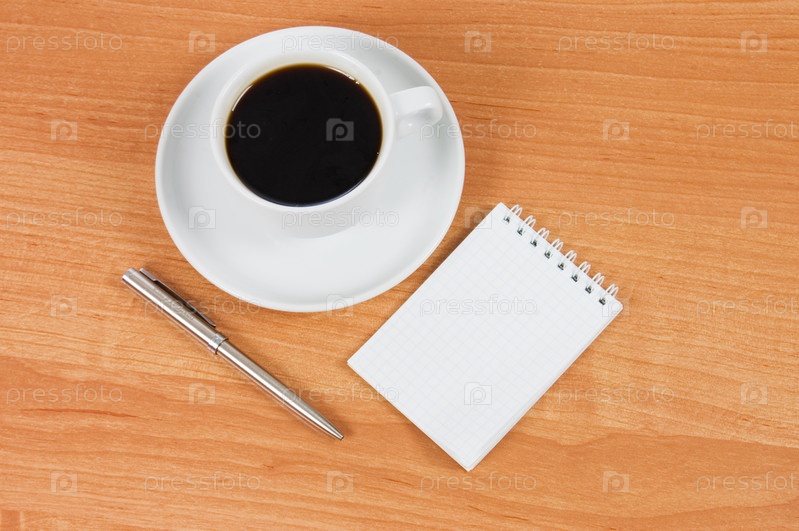 Чашка кофе и блокнот с ручкой на деревянном столе