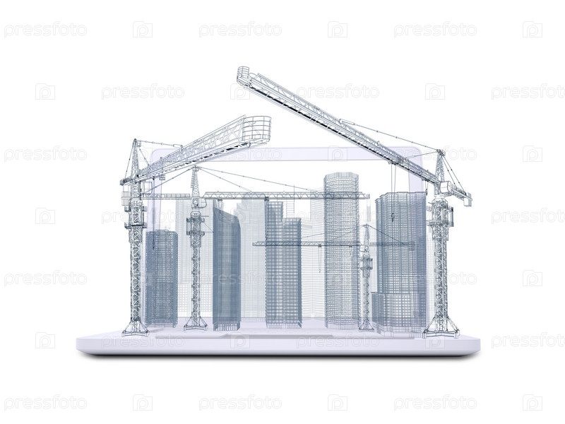 Башенный кран и небоскребы на планшете