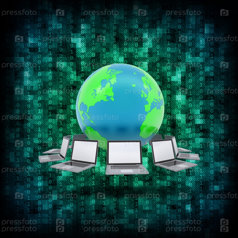 Двоичный код и земля с ноутбуками