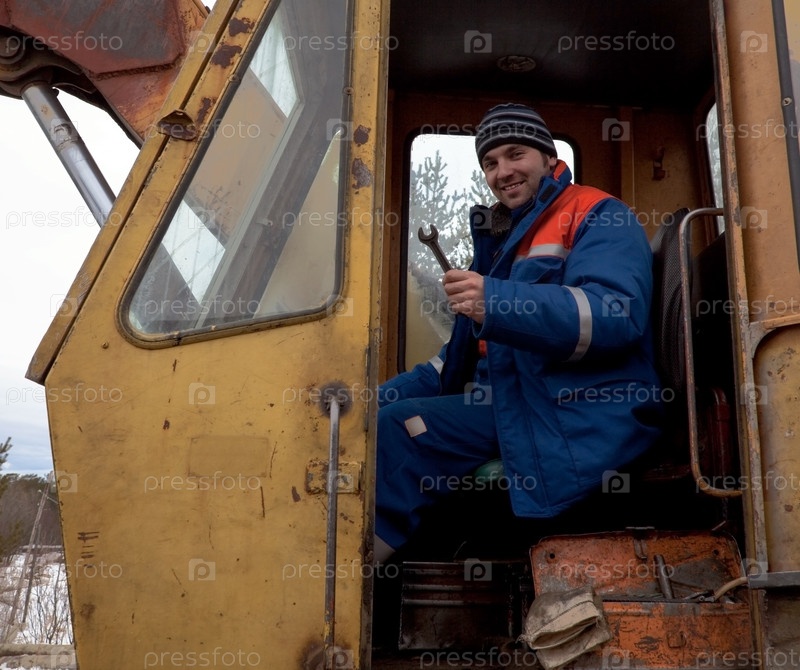 Машинист экскаватора с гаечным ключом в руке
