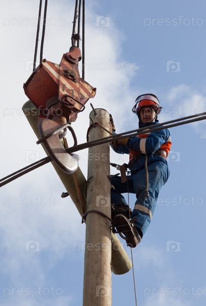 Электрик работает на столбе