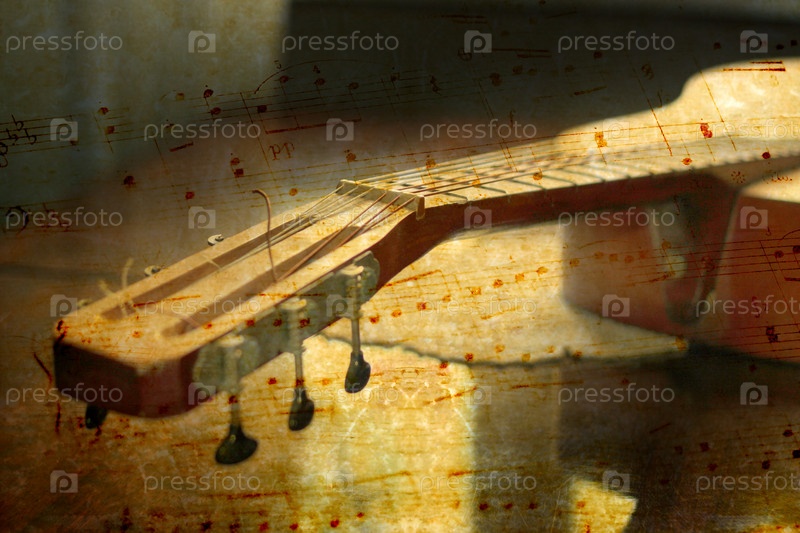 Гриф акустической гитары на фоне старого нотного листа