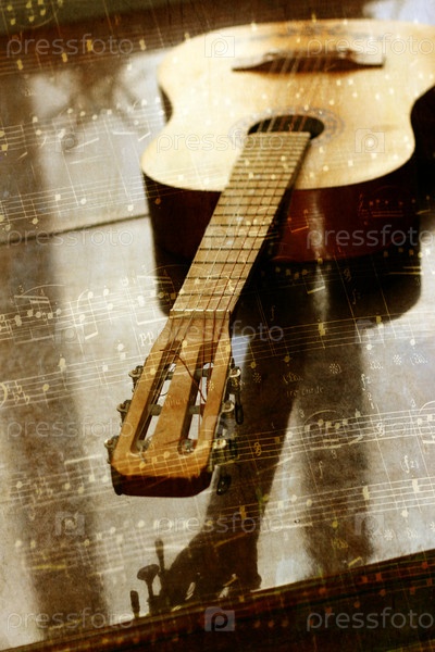 Акустическая гитара на фоне старого нотного листа