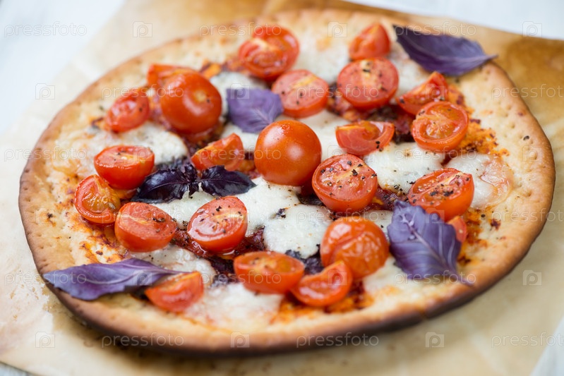 Пицца с помидорами черри, моцареллой и базиликом