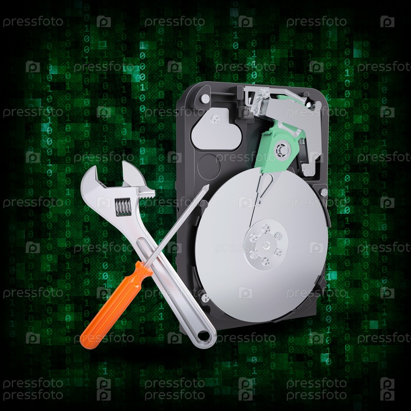 Жесткий диск, лупа и разводной ключ