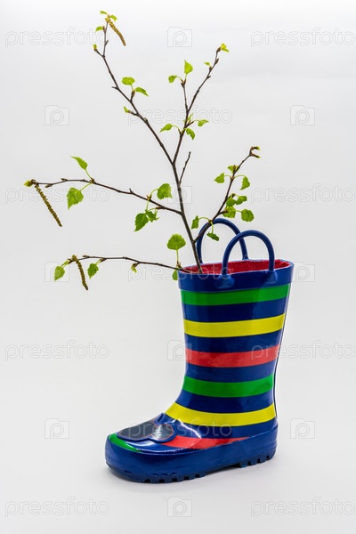 Веточка березы с цветущими листьями на белом фоне