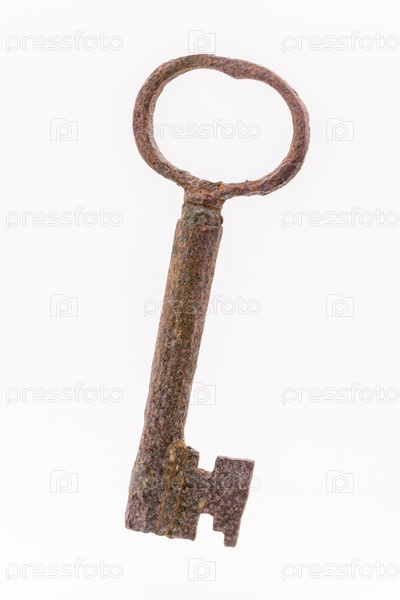 Старый ржавый ключ на белом фоне