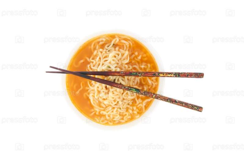 Японская лапша и палочки на белом фоне