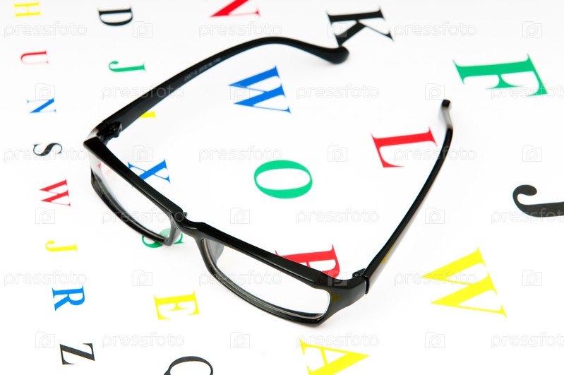 Очки для чтения на листе с буквами