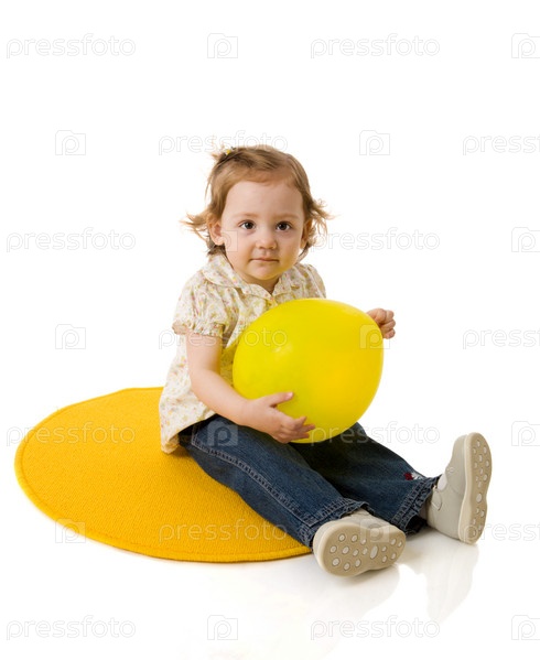 Двухлетняя девочка с шариком сидит на коврике
