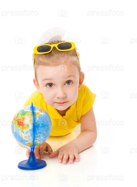 Трехлетняя девочка лежит с глобусом на белом фоне