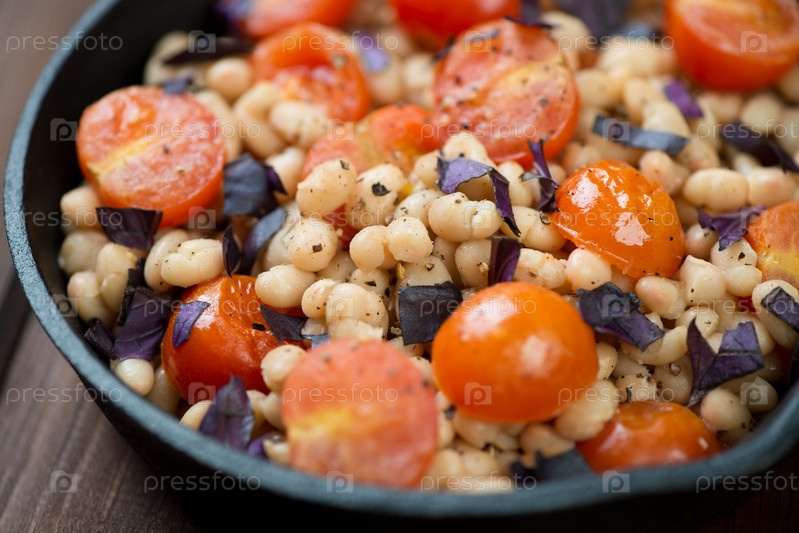 Запеченная фасоль с помидорами черри в сковороде
