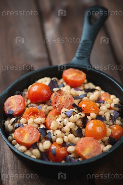 Запеченная фасоль с помидорами черри в сковороде