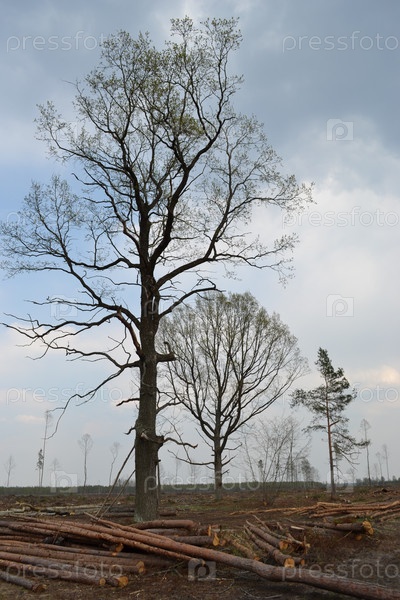 Растущие деревья рядом со спиленным лесом