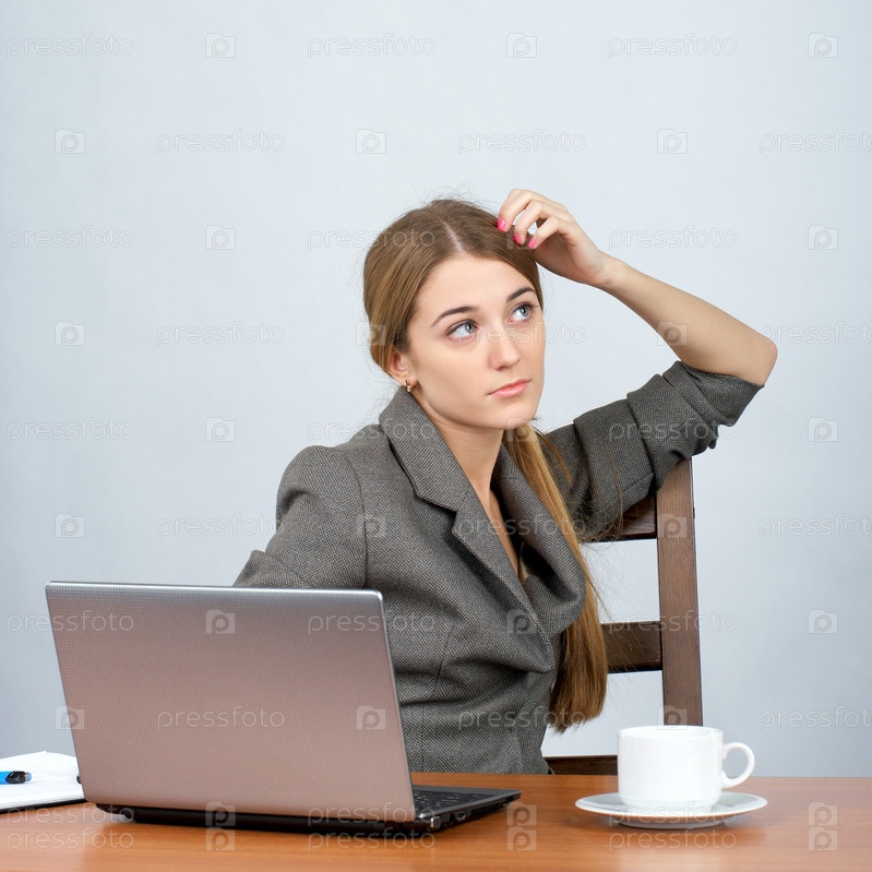 Деловая женщина смотрит вдаль, положив локоть на стул