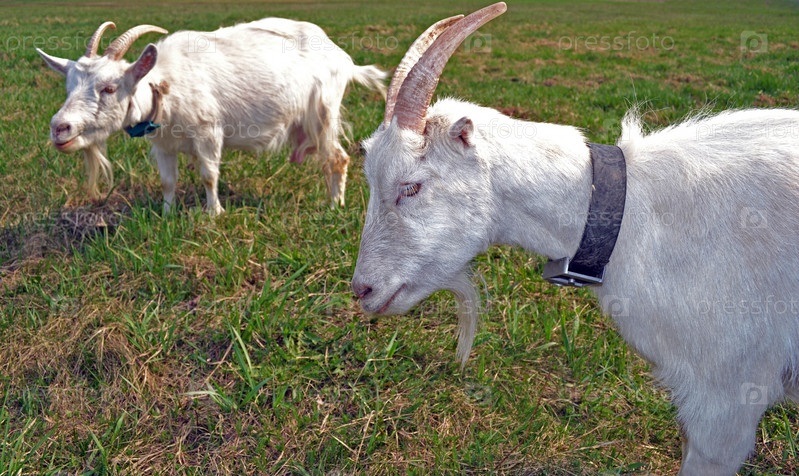 Две белых козы пасутся на зеленом поле
