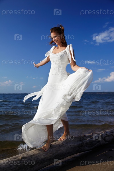 Невеста идет по бревну на берегу моря
