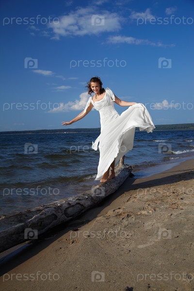 Невеста идет по бревну на берегу моря