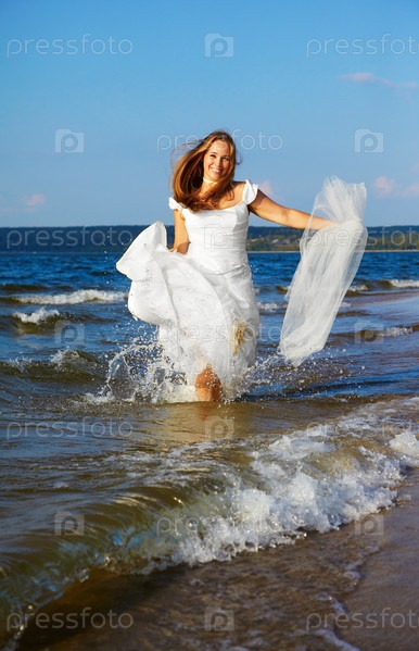 Невеста в белом платье идет по колено в море