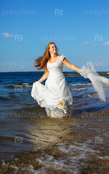 Невеста в белом платье идет по колено в море