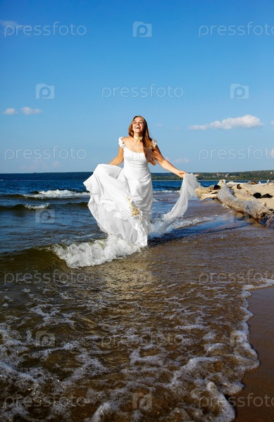Невеста в белом платье идет по воде