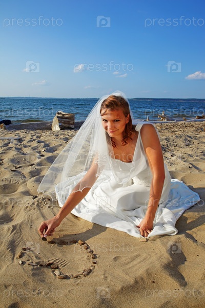 Невеста выкладывает сердечко из камней на песчаном пляже
