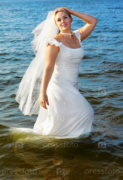 Невеста в белом платье купается в море