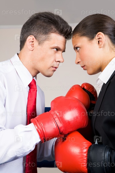 Фото агрессивных деловых партнеров в боксерских перчатках, сражающихся друг с другом