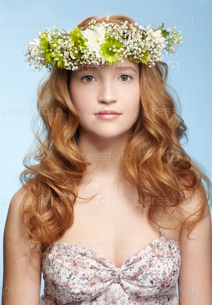 Красивая молодая рыжеволосая девушка с венком из цветов на голове на голубом фоне