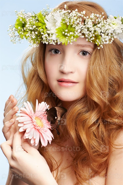 Красивая молодая рыжеволосая девушка с венком из цветов на голове, с цветком в руке на голубом фоне