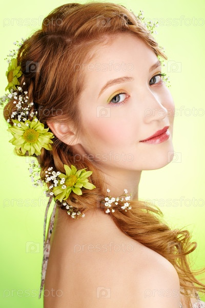 Портрет красивой девушки с цветами в волосах на зеленом фоне