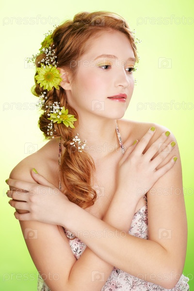 Портрет красивой девушки с цветами в волосах на зеленом фоне