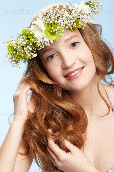 Портрет красивой улыбающейся девушки с венком из цветов на голове
