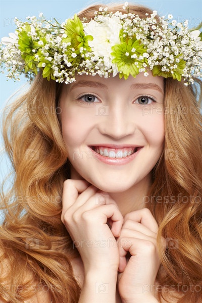 Портрет красивой улыбающейся девушки с венком из цветов на голове