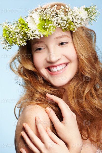 Портрет красивой улыбающейся девушки с венком из цветов на голове