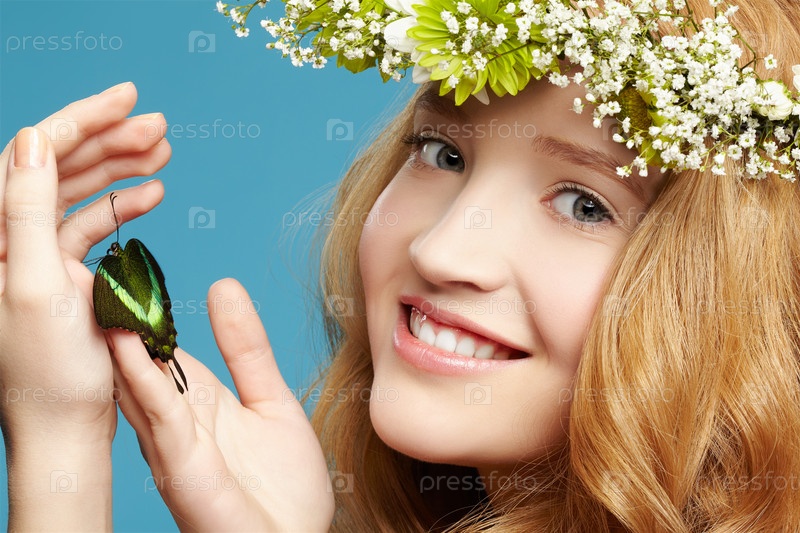 Рыжеволосая девушка с венком на голове и с бабочкой в руках