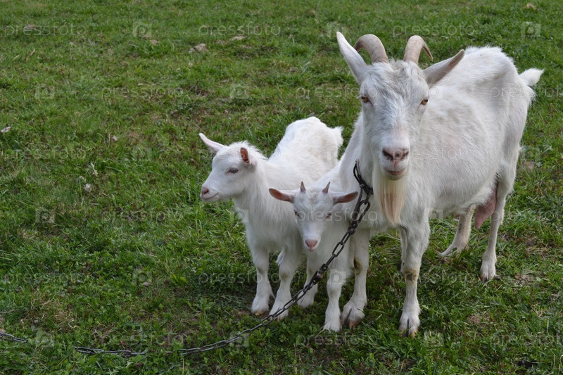 Коза с маленькими козлятами на зеленом лугу