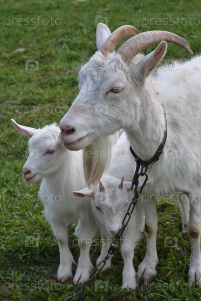 Коза с маленькими козлятами на зеленом лугу