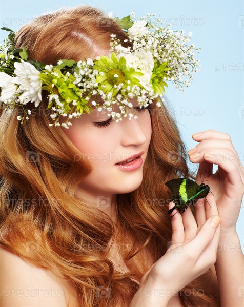 Рыжеволосая девушка с венком на голове и с бабочкой в руках